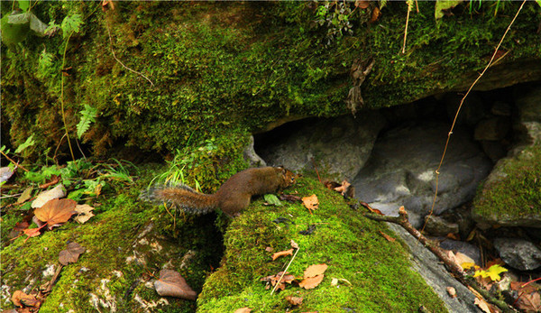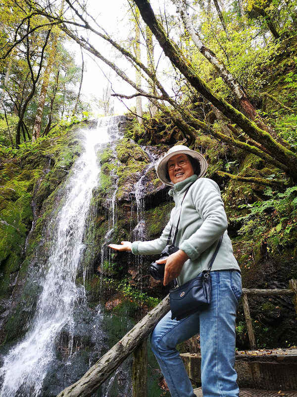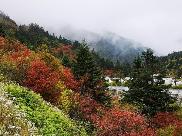 从山顶往下走是顺一条小溪,叫金猴溪。因为在这里发现有野生金丝猴而得名,圈养的金丝猴和旁边的展馆,让我们知道金丝猴是多么珍贵的野生动物。这里面是绝顶的原始,气候湿润,山水顺山势奔流直下,常年水势不减,与其说这是溪流不如说它就是一整条瀑布。金猴溪在神农顶景区里。溪水哗哗,林木茂密,上面长满青苔且很厚,绿茸茸的,只是天气阴暗让这里更觉原始的静谧与潮暗,最爽的是没有游人,就我们两个,顺着金猴溪往下走,瀑布从上分几个叠层倾泻下来,直到金猴飞瀑。再顺着飞瀑往下走,水声哗哗渐而叮咚,伴随着林中树叶的沙沙声和鸟儿的啾啾声,这大自然的交响乐如痴如醉般的迷恋着你。只是叶生不断催促快走,真想在这里坐下来慢慢享受人间仙境,人在景中只顾享受其中美妙竟然没有打开地图研究其在神农架中的方位,只好后来补课,其实这是去神农顶必经之路。脚步未停便走下来上车继续向前行,经过神农源继续向高处行进。哇,路边出现大片的红叶,染的整个山坡松杉吐翠,红桦披锦,五彩斑斓,不由得叫停下车拍照。
