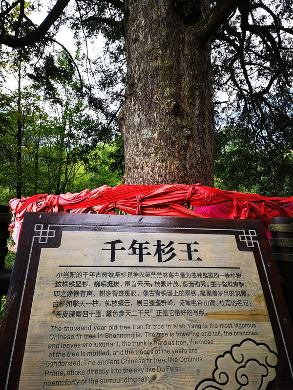 9:15h来到神农坛景区,这里分为四个部分:古老植物园、千年杉王、神农祭坛、购物长廊。神农坛是人造景点,除了一棵“千年杉王”之外,全都是人造的。最高处有神农炎帝的大型雕像,像下面是长梯,祭坛,游客多时会有祭祀表演。我们没有赶上。只是在那棵杉树王前停留一会儿,因台阶太高没有上祭坛。9:58h离开这里。