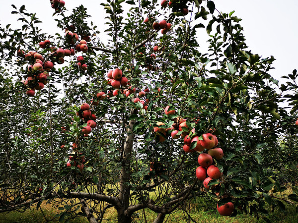 中午饭在一家小店吃大盘鸡,吃得还算舒服。一路上满目果园丰收景象,枝头柿子火般黄,软籽石榴袋里装,大红苹果仰脸笑,猕猴桃子林中藏。两点多钟时行进到山西运城万荣县南张乡国道旁,还是忍不住停车钻进苹果园里拍照。好大一片果林没人管,可惜红红的果子基本都被虫咬过。