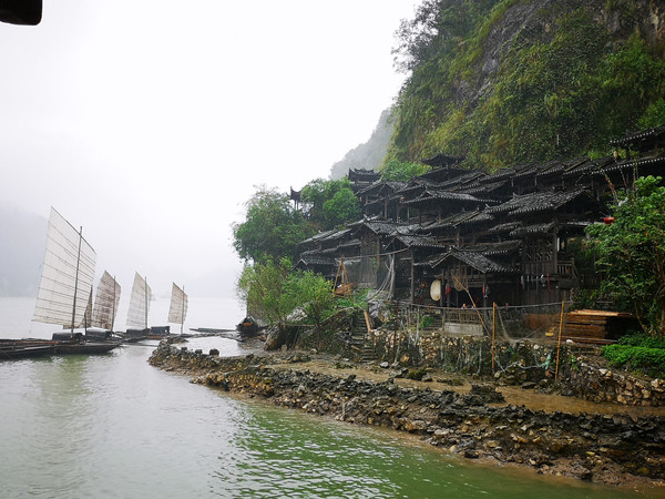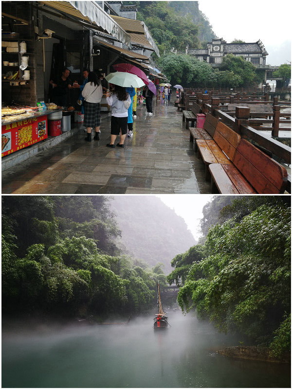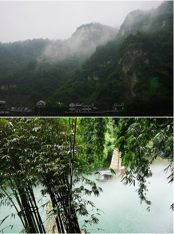 昨晚才问清楚,今天必须过江对面景区大门买船票(实际上就是变相的门票,因为疫情期间免门票,所以来这里必须要买船票,即使已经过了江也还的过去买)。费时费事实在是太坑人。早上7点起来还在下雨,叶生把车开到门口找出雨伞和雨具,早早在这边景区找个小摊吃了粥和大饼,等对面的船过来。出门不能心急要耐心面对,只想愉快的事,叶生没有乘过长江上的船,把乘船当做一次体验,所以也很开心。往返回来已经一个多小时,船上人很多,想拍两岸风景也很难,只见人头和雨伞。我没有带大相机,这种天气什么相机也拍不到好照片。从网上看,说的很美:“三峡人家一肩挑两坝,一江携两溪,这里石、瀑、洞、泉……多种景观元素巧妙组合,山有山的伟岸,水有水的柔媚,洞有洞的神奇,瀑有瀑的壮丽,石有石的气质。极致大自然之天工造化,这里有洪荒之美、这里有苍凉之美、这里有阴柔之美、这里更有雄浑之美。”但是在节日期间,再好的景观也是一堆人,一些景点根本不想去,整个三峡人家不过就是在长约一公里多的江边商业街。我们全副武装雨衣雨鞋加雨伞,满目都是像我们这样的游人,那还有什么景观?就是人的流动,五颜六色的雨衣雨伞还有人的骚动声。加上那些商业店铺的吆喝,炸鱼炸土豆炸臭豆腐的烟熏味儿,哪还有什么游览心情?,随着人流来到一个小溪处,才看到一点景色,这里是龙进溪水与长江的交汇处,一坝拦住溪水,形成一汪碧绿的水潭,水上有小船鱼人在作秀供游人拍照,绕过一座小桥这段路的景色成为这次三峡人家的经典风景,尽管人头钻动,还是抓拍了几张照片,匆匆逃离这人海嘈杂的景区,继续南下。