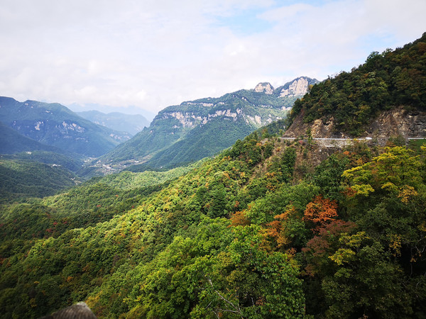 11:15h来到一个景点,旁边有一尊雕像,记载曾经有一名叫陈传香的少女赤手打死野花豹救出幼童的故事。这里理应是红坪区,神农架的稀有植物让我新奇。山上颜色开始多彩,红枫黄杉翠竹点缀其间,为了赶路不能停车拍照。11.19分过了燕子垭隧道来到一处观景台,呵呵好美的景色,神农架群山一望无际尽收眼底,前看沃野千里,碧连天际;后望盘山公路,银蛇飞舞;左指群峰争拔,直达巴蜀;右览林海茫茫,绿树接天。太阳时隐时现,山沟底下隐约有人家。好一派神农架风光。置身在这群山中,欣赏群峰环绕起伏、林木葱茏幽翠之美景,体验大自然造化中壮美灵动的山水风光。叶生如儿童般的兴奋,当然每遇好景必用他的神器拍视频。11.37进入红屏画廊景区。在紅坪鎮路旁有一个大大的犀牛塑像,这里需购票进入古犀牛洞景区,再徒步上山进入洞中,曾经在洞里发现过古代犀牛化石,故叫犀牛洞。我们没有停顿继续赶路。