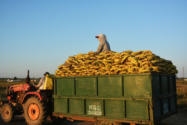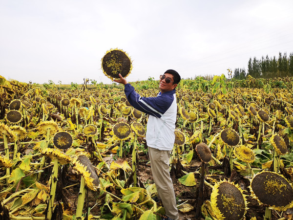 早上9:14分启程去五原县。但是我要绕道西小召去看望我的同学。7月份曾经专程去过她家,接送她到县城里参加同学聚会。因为她是我们班女生中唯一务农的农民。10点20分来到西小召加油站204元加满油,10分钟后来到同学家的葵花地里。哇!丰收景象,好大的葵花盘子,有大盆那么大,一家人都在砍葵花,同学在路边接我们过去,就在高速路下面几十米处。拍照,拍照,我拿起镰刀学着她们的方法,先砍头再斩身,在杆子不到一米处斜刀砍下去,然后把葵花头斜插到杆子上,面朝太阳让它晒干。早几天已经发现这样的葵花地,还觉得好生奇怪,后来明白它的妙处,比原来摆放在地面快干又方便,我问同学是谁发明这种收割方法,她说不知道,我想这个农民很聪明,惠及了整个葵农。我在这丰收地里撒欢,同学的儿女们教我怎么做,又夸我有情意专程来看他父母,同学的老公也是我的小学和中学的同班同学。11点钟了,我依依不舍地离开这片我童年时代的土地——西小召,直奔五原县。11:45时抵达。总里程80.4公里。