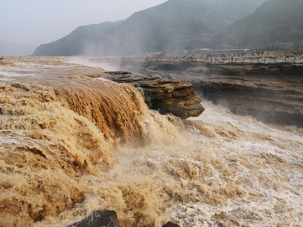 游客不是很多,由于还是涨水期,瀑布很壮观,从上游往下有几处景观,在最窄处汇聚出滔天巨浪咆哮而泻。游人聚集处在最上游的一块巨石下,瀑布不长却猛。景区有几位陕西老农打扮的赶驴人在招徕客人照相,那些穿戴成陕西味儿的媳妇呲牙咧嘴的照相,土味怪相百出,也算中国旅游景点的一种奇葩。我在想,黄河历经千百万年,从巴颜喀拉山脉经黄土高原流下,到这里奔腾向下到中华大平原入渤海,其两岸人类也经历了千百万年的生生不息,而我不过是其中一滴水,有时溅起小小浪花,有时被卷入洪流之底,最终也要汇入大海,谁还知道你的存在?上帝给了你一次人生,就过好这一生,荣辱成败又有何妨?在大自然面前,人类只不过就是一滴水,一片云,一株草亦或是一棵树。