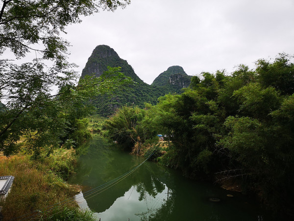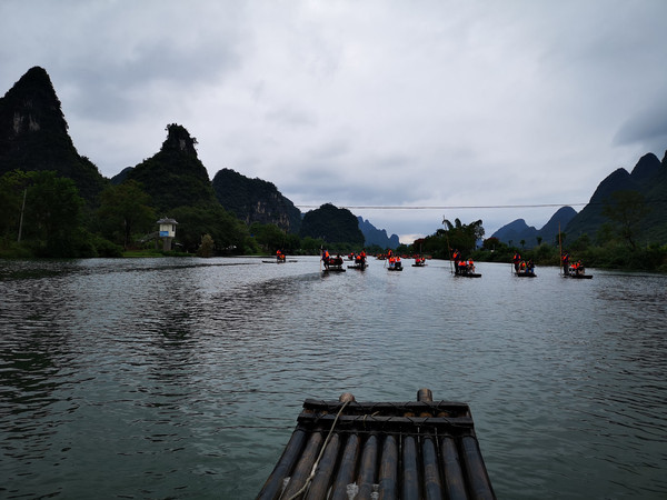 遇龙河是漓江在阳朔境内最长的一条支流,一般宽度为30一60米,水深处达七八米,浅处只能齐腿肚。全长43.5公里。坐在竹筏的竹椅上慢慢飘移,遇龙河两岸山峰清秀迤逦,连绵起伏,形态万千,江岸绿草如茵,翠竹葱郁,树木繁荫,水色如翡翠,清澈透亮,偶尔也能看到鱼儿闲游。水筏飘摇,艄公左右撑竹,微风拂过水面,泛起阵阵涟漪,如同小提琴奏出的音符,静静的,轻轻的。国内外专家一致确认,“遇龙河是世界上一流的人类共有的自然遗产。”远处一派田园风光,农家人河边洗衣,赏心悦目。天平绿洲、平湖倒影、夏棠胜境、双流古渡、梦幻河谷等等都是从文字上描写的景点,我们不知道在哪里,但是身在江中,看着一江竹筏星星点点来来往往的载客穿梭在江上,游人身着橙红色的救生衣远山近水中格外醒目,让人仿佛进入了天人合一的诗意境界,返璞归真的自由天地。真是一条流着一江风情和灵气的小漓江。我们的手机相机不停的变换着拍照,又生怕掉在江中,忙乱的不亦乐乎。遇到一个坝,机器把竹筏送过去,转一个弯又从坝上飘落下来,给你一个大大的跌落刺激,我们穿了水鞋,许多人在这里被水淹没了半条腿,每个竹筏在这里都会发出尖叫般的笑声。40多分钟的时间不长一会儿就返回来上岸。小路上那粗壮的竹林甚是秀美,10点06分离开遇龙河,去阳朔镇玩。行程7.4公里,半小时后来到阳朔城区,转了一大圈才找到停车场,每小时10元。