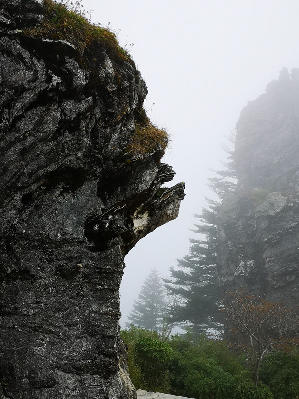 14:40h来到一个被云雾笼罩的地方:板壁岩。这个景点是一个典型的高山植被原始生态分布区,有高山草甸、箭竹、高山杜鹃,原始森林和形态各异的石林。是以秀绿的亚高山自然风光与生物多样性为特色的自然生态旅游景点,景区内动植物资源十分丰富,保存着完整的亚热带森林生态系统。一条小石子路蜿蜓平缓,两面有一丛丛箭竹和杜鹃,不时看到一座座怪石山隐约在面前,司机导游解说着由其形状而命名的石山:雏凤待哺,雄鸡报晓,美女照镜,灵龟戏雾,神龙锦屏,生命之根,妙笔生花等等,最出彩的是那面野人石山,拍照出来就是一个侧面野人头像,耳鼻眼口头发样样俱全,真乃天然的艺术雕像。天气很冷,拍照的手都冻得发麻,下山吧。