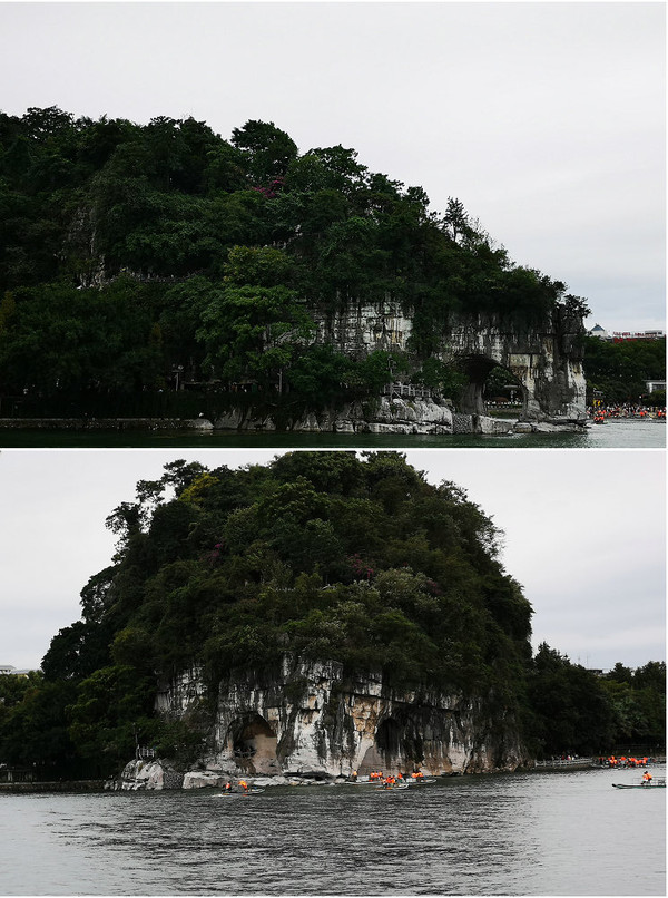 从1点40分休息到4点多开车去景点,在市里转几个弯都没有停车处,一个骑摩托车的女士趁红绿灯上来拉客,说可以带到游漓江景区有停车场。跟着这女士来到象山区安新码头,车停在码头附近小区门口,小区人负责看管每车10元,还不错。船票每人65元,那位女士就是为游船拉客赚提成,不收我们的费用。将近5点钟乘上船,40分钟游漓江象鼻山。2009年儿子暑假回来时已经体验过了,不过我们两人来玩境况又不同了,好好享受这漓江风光吧。风很大,但是我还是一直在露天平台上赏景拍照。毕竟11年了,景是人非,象鼻山还是那样傻傻的像个大老鼠或者是大刺猬卧在漓江上(看象鼻山要在对面岸边才有大象的气派)。我第一次来是1995年纪念抗战胜利50周年理论研讨会上,我带着论文参加会议,会议安排参观的,那时河对岸很少人,我还穿了刘三姐服装在竹排上拍照,参观骆驼山,游漓江到阳朔。那时的景点还很原始,人也少。现在的条件好了,我总是会想着与儿子在江上游玩的情境,那时儿子还在读大学,英俊帅气的青年学生样,留一头长发,穿一件条形短袖衫。江两岸也有一些风景,解说员在扩音器里介绍着,彩色灯光打在岸边树丛上增添一些灵动的氛围。可惜阴天,否则这个时候正是观日落之时。结束游漓江后在附近饭店吃晚饭,遇见一家四口广东人在旁边用餐,互相聊旅行故事。晚饭吃的不错,牛肉烧苦瓜鱼头豆腐汤。7点多才离开饭店半小时后回到酒店。