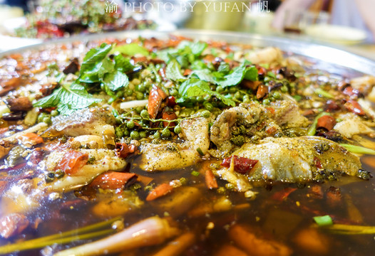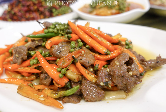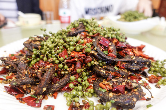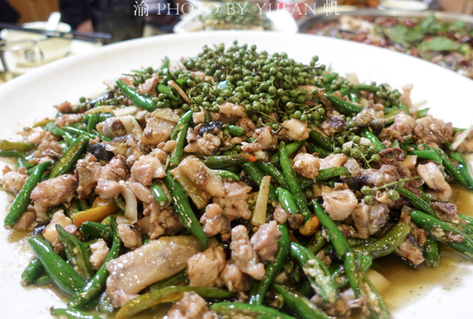 中餐的时候,当一盘盘色香味俱全川菜佳肴上桌之时,我们发现一个共同的特点,那就是每一道菜里面都运用了很多青花椒,虽然有的只是像葱花一样放在菜品上面作为点缀,但依然颠覆了我们对花椒用法的认知。