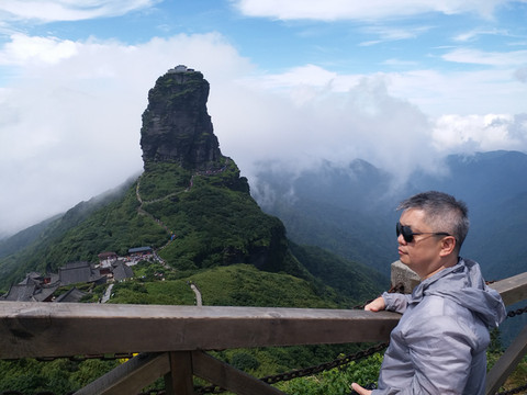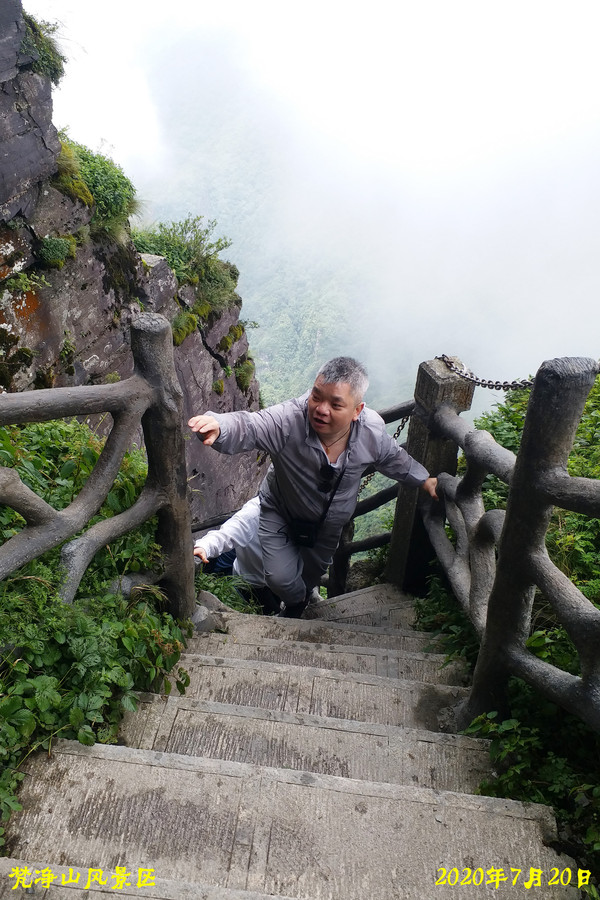 7月20日,不到八点我们出民宿(我们订的梵净山上山时间段是八点到九点,民宿离梵净山大门不到10分钟的步行距离),经过测量体温扫描贵州健康码进入排队的行列中,到山门时突然队伍停了下来,之前都是缓慢行进,一问工作人员,得知电瓶车接不上,载人上去后要返回需要一定的时间,8点30分进入山门坐上了电瓶车,20分钟车程到达缆车车站,又经过十多分钟的排队坐上了缆车,10分钟后下了缆车,稍事休息后开始2000级台阶的登山(全程都是步行木梯),45分钟后到达蘑菇石、翻天印,人很多,蘑菇石在以前给我的感觉很高很大,自从19年登梵净山看到实景后,才知道看到的照片都是摄影师照相时角度不同造成的错觉,儿子对我说也有同感。