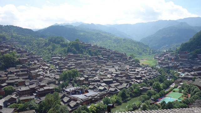 原汁原味的苗族舞蹈和表现苗族年轻人相亲的场景剧,整场表演4个节目大概30分钟,观众不时鼓掌,苗族敬酒正好有我,酒不甜,喝不惯。之后我们走到4号桥,这里有条小路直达观景台,路标指示距离和走到1号桥坐电瓶车的距离一样,我们就步行上山了,其实我忽略了一个问题,就是直线距离,到1号桥直线距离是这么长,但上山就要乘以N倍了,上路十八弯,儿子他妈已经转昏了,差不多要中暑了,还好顺利到达观景台。观景台上可以欣赏千户苗寨的全貌,