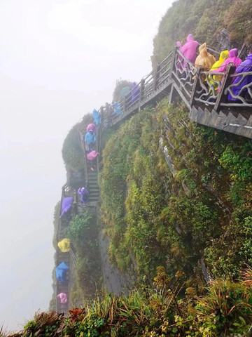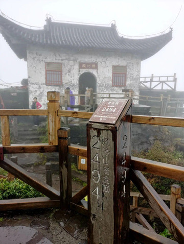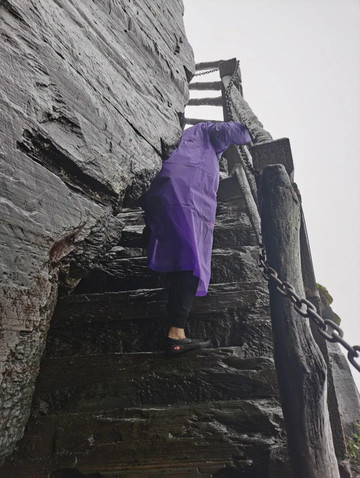 我去的那天不见太阳,倒也没有下雨,同行的游客说他已经等了两天,都是阴雨绵绵,趁着没雨抓紧登山,看来是等不到晴天了。山下没雨,山上却阵雨不断,而且云雾缭绕,没有能体验到观景的旷达,登山的艰险却让人印象深刻。