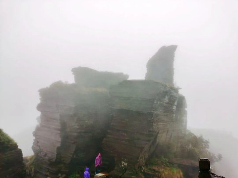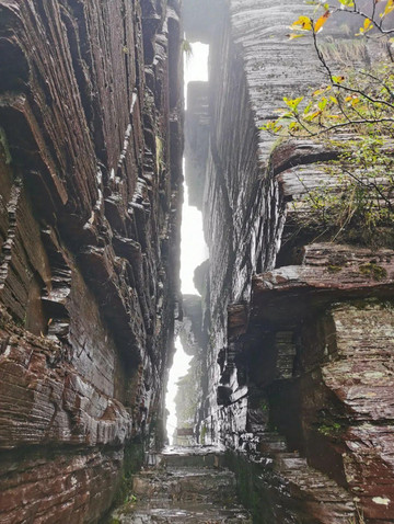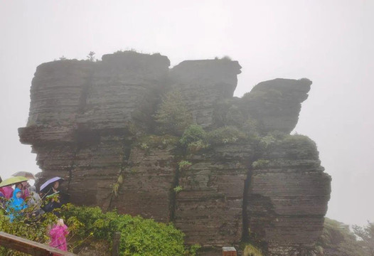 看不到景,在老金顶只停留了一会儿,下来的时候路过一处山崖,两侧绝壁上的纹路似书页堆叠,此处景观叫“万卷经书”。相传唐僧西天取经归来,曾专程到梵净山拜谒弥勒大佛,由于白龙马偶失前蹄,撒下一叠经书,经书在此落地生根,就成了这一“万卷经书”奇观。
