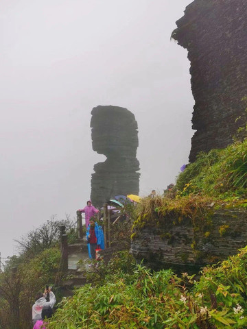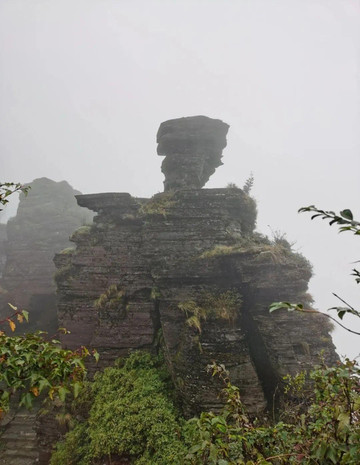 这些石头本身就是梵净山一大景观,其中最有名的叫“蘑菇石”,是梵净山乃至贵州的标志性景点。此石为砂质板岩和石英砂岩形成的方形石柱,高约10米,由一正方形巨石错位覆盖在一长方形巨石之上,上大下小,形似蘑菇 。它看上去亭亭玉立,似风吹即倒,实际上已在风霜雨雪中岿然不动屹立了亿万年。