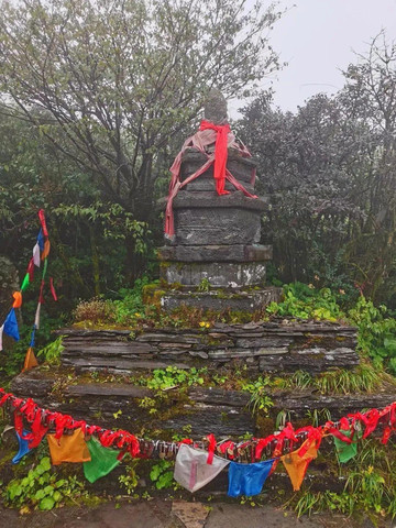 老金顶的建筑不像其他名山顶建筑那样金碧辉煌,只有一座简陋的殿宇,叫“燃灯殿”,殿内供奉着过去佛——燃灯古佛。攀登的过程着实不易,又陡峭又湿滑,山顶却笼罩着厚厚的云雾,看不到远处风光,有些灰心。
