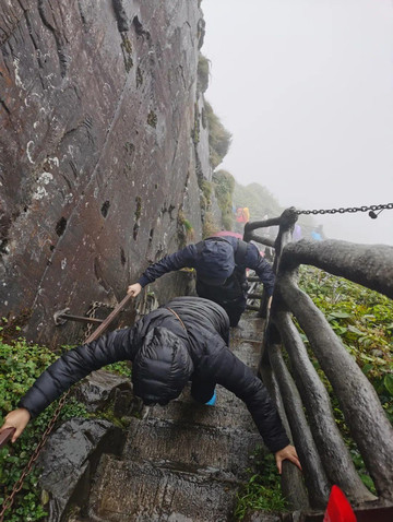 因为这一段围山而上的石梯极其狭窄,狭窄到很多地方只容一人通过,且需侧身通过,体型大于常人者就不要想着登金顶了;极其陡峭,最陡的地方说90度有点夸张,接近垂直是真的,一路挂有铁链,攀登者需要手脚并用,如果不手抓铁链,很难爬上又高有陡的石梯;加上雨天湿滑,人还不少,有一多半时间是在排队等候中过去的。