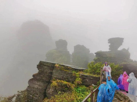 停车点不远处是一条木栈道,全长750米,是徒步登山的唯一路径。这里已经处于海拔2100米以上的云线,一路上可以欣赏梵净山原始丛林的自然之美。