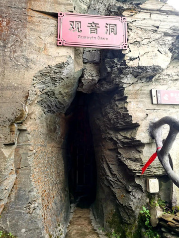 途中经过绝壁上的一处石穴,名叫“观音洞”,洞中供奉观音菩萨,洞下是万丈深谷。观音洞又叫“打儿洞”,传说长期未生育的善男信女向金顶磕三个响头,再带一块小石头丢入这个洞中,必得佛赐子女并健康成长。