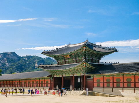 景福宫是李朝(1392~1910年)时期韩国首尔的五大宫之一,也是李氏王朝的正宫,它是李朝的始祖—太祖李成桂(1392~1398年在位)于1395年将原来高丽的首都迁移时建造的新王朝的宫殿,具有500年历史。中国古代《诗经》中曾有“君子万年,介尔景福”的诗句,此殿籍此而得名,因位于汉阳北部,也叫“北阙”。
