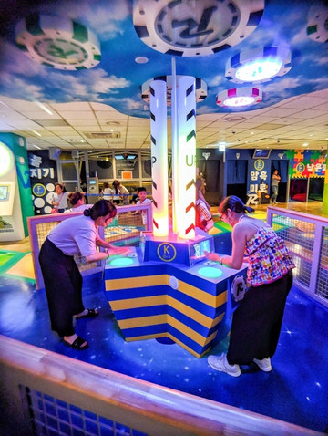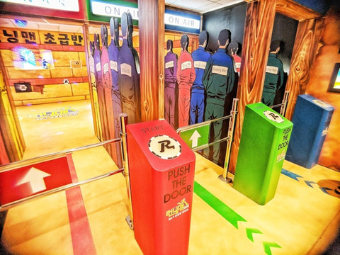 位于仁寺洞SM免税店地下一楼的Running Man主题体验馆,地理位置非常方便。到SM免税店门口后,沿着楼梯往下走,慢慢就会进入到RM的世界。到了门口会看到RM背板,可以拍照,除此之外还会看到各项关卡的介绍,这些关卡区域可是根据Running Man十年来的经典名场景设计的游戏关卡呢!如果你是铁粉,进来后肯定会很怀念的。