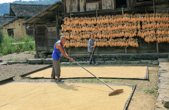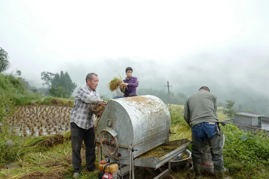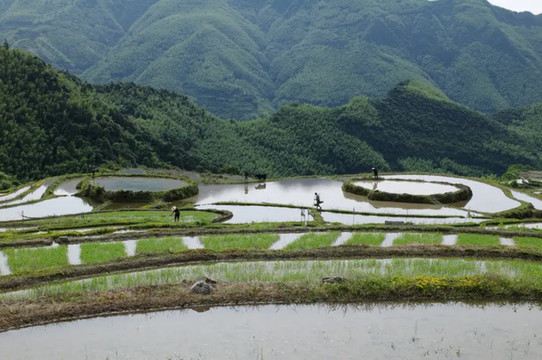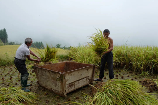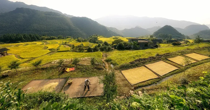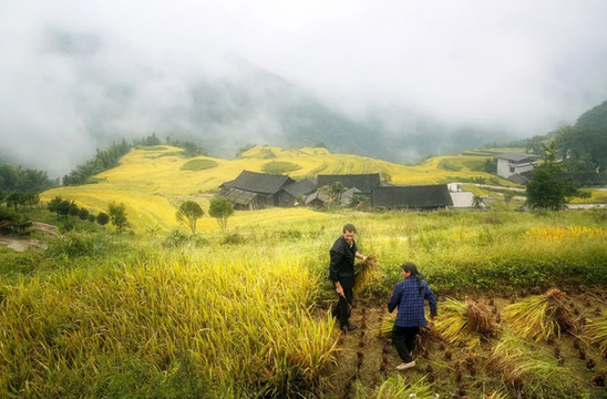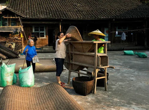 塘家梯田位于舜皇山塘家工区,这里居住着一群纯朴的老百姓,由于处在大山深处,山高路陡,梯田每块面积细长且窄,不便于机械化管理,这里的人们仍然使用原始的劳作方式,禾桶打禾,风车吹谷的简单方法。