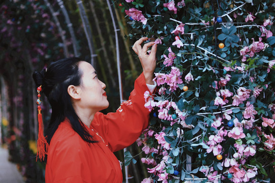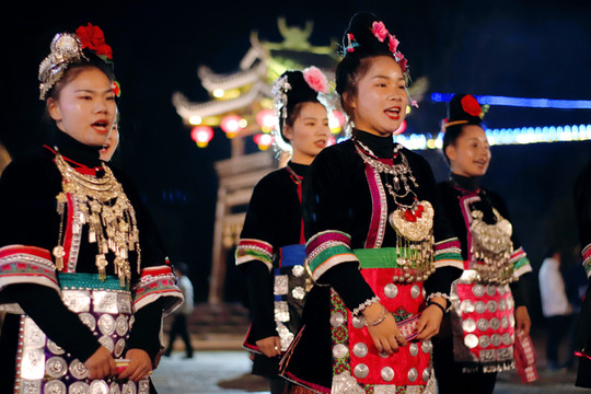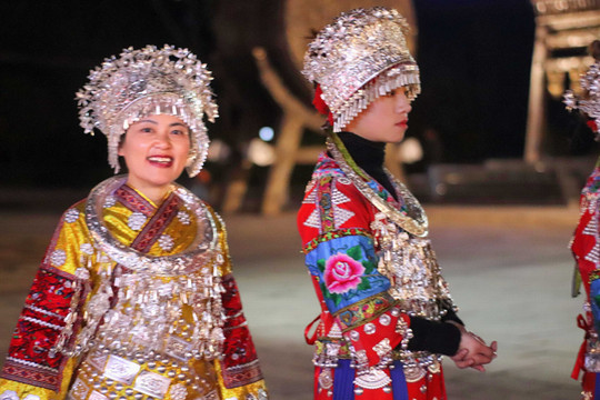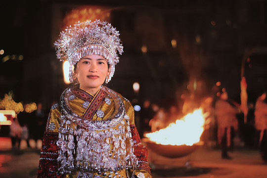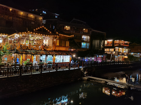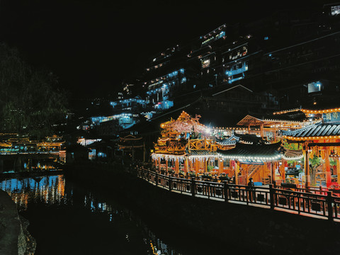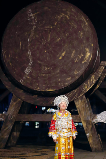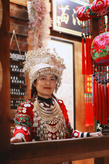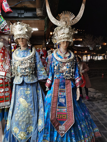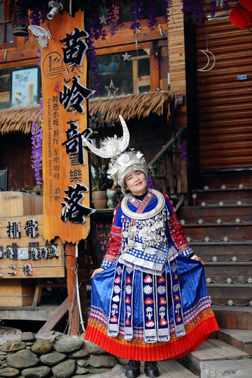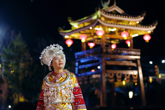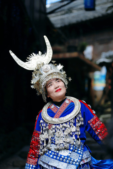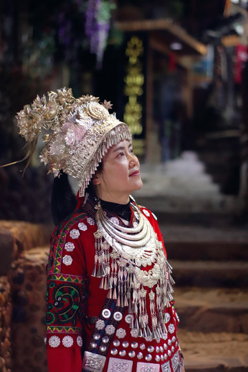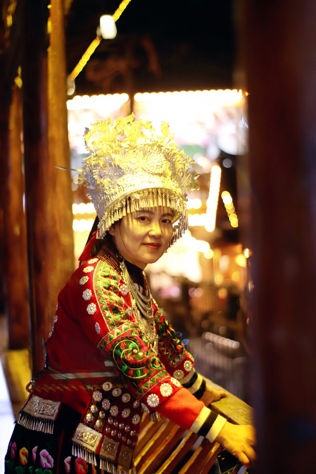 穿着苗族服饰在夜晚的苗寨里穿梭,仿佛这里已经是自己的家一样