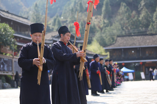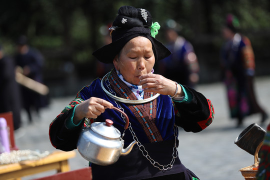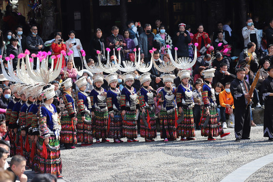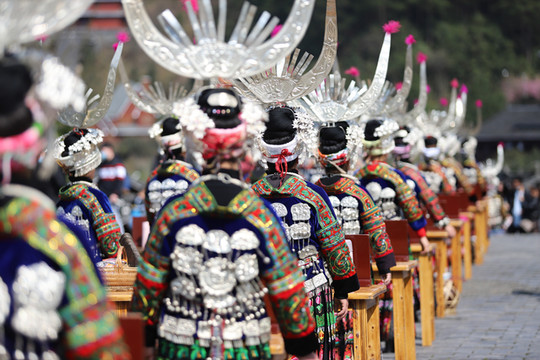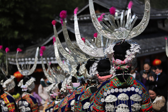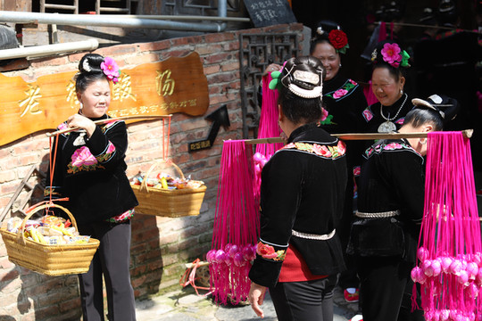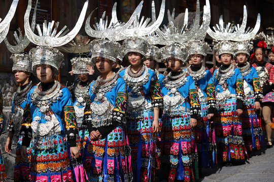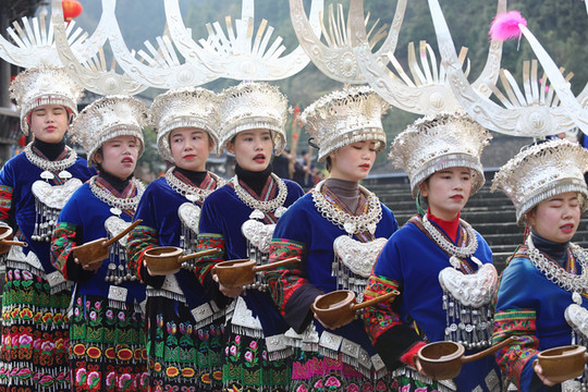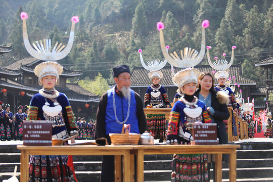 见到西江千户苗寨大门就被眼前的景象吸引了,身穿苗族传统服饰的阿哥阿妹,阿公阿婆一字排开欢迎远到的客人。苗族酒友一个非常复杂的风俗习惯,这就是苗族的拦门酒。随着现在旅游的发展,拦门酒已经是苗家人待客的一道靓丽的风景线。当你来到苗寨旅游时,首先迎接你的必定是一碗香甜的酒。无论是男人还是女人,都必须得喝,不过也不用担心,没有酒量的话,喝点甜糯米酒,味道十分甘甜。