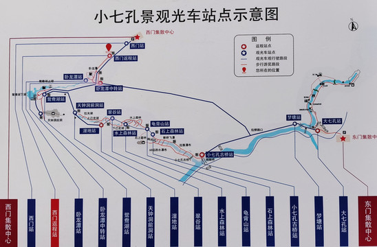小七孔景区呈东西走向,如果你是从东门进入时乘坐观光车沿途不要下车一直坐到西门,然后从西门一路玩过来不走回头路是行规;反之,从西门进入后坐观光车一直坐到东门,然后从东门向西一路玩下去。
