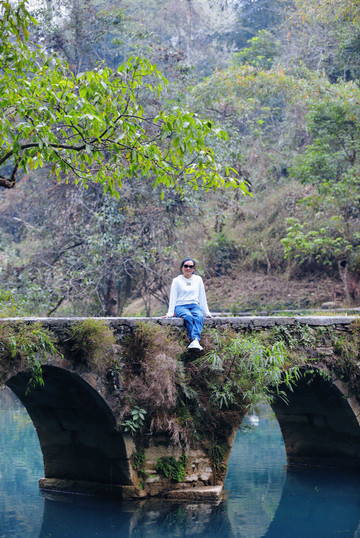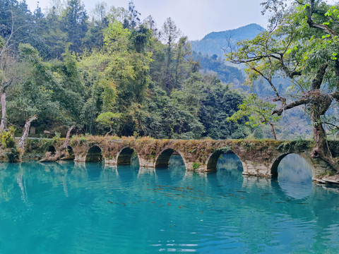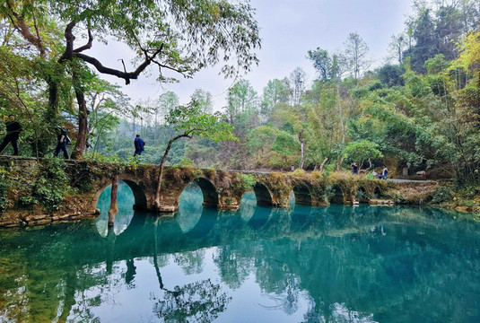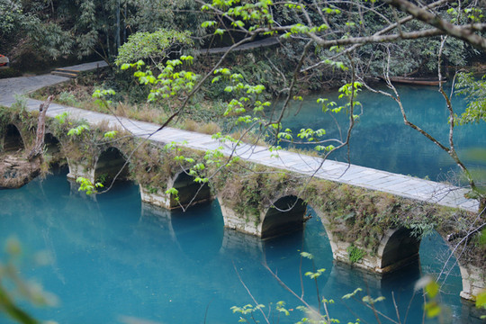 小七孔古桥——位于景区之首,景区之名由桥而得。这是一座小巧玲珑的七孔古石桥,桥长25米,桥面宽4米,拱高4米,建于 清道 光15(1836)年,昔为沟通 荔波 至 广西 的重要桥梁。桥由麻石条砌成,桥身爬满藤蔓和蕨类;古色古香的桥下是绿得令人心醉的涵碧潭。两岸古木参天,巨大的虬枝沿着桥伸臂,宛如巨伞撑在桥上。