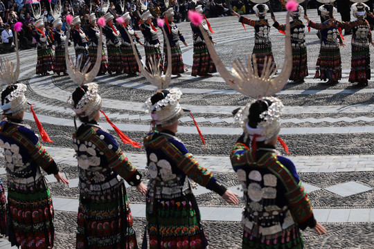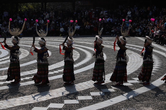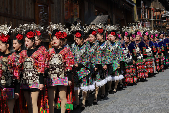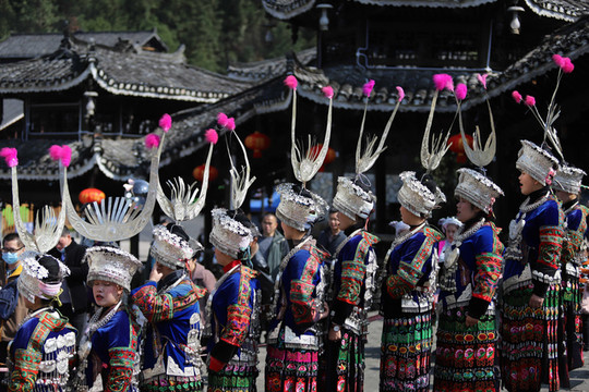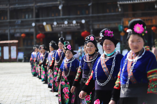 当走到苗族博物馆的时候正赶上有大型歌舞表演,穿着盛装的人们列队在街道两旁边准备进入广场