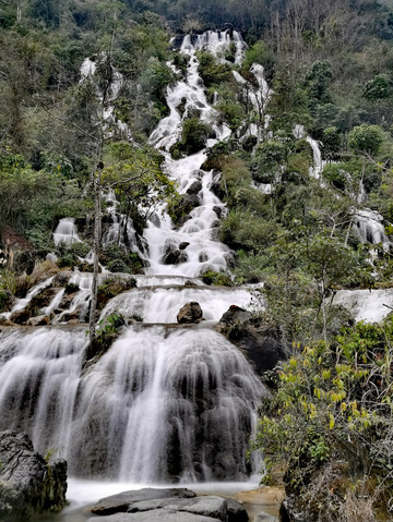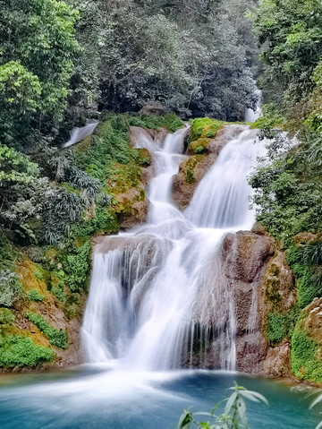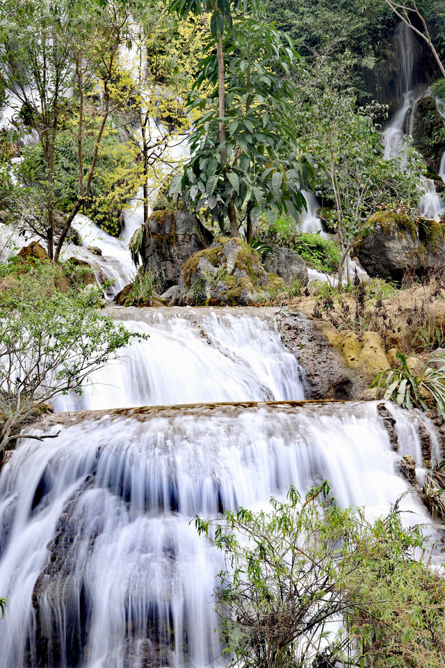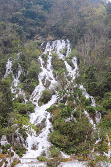 翠谷瀑布因为群峰紧锁,群山苍翠欲滴,故名“翠谷”。翠谷瀑布悬于群山之腰,是小七孔景区落差最大的瀑布。翠谷瀑布的瀑水在两座山头之间出现,呈多级下跌倾泻,瀑流从近山垭口处喷涌而出,瀑流处是七八十度的陡坡。用相机目测一下,瀑高约六七十米,远看似条玉带悬于山间。水顺山势倾泻而下,略呈上小下大的扇形态势,多条水流交叉穿插,浪花飞溅,水雾蒙蒙,犹如群龙下山,清新悦目。