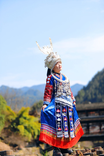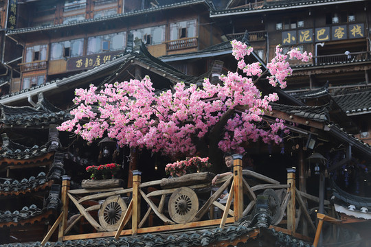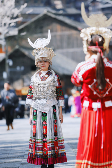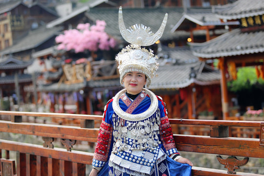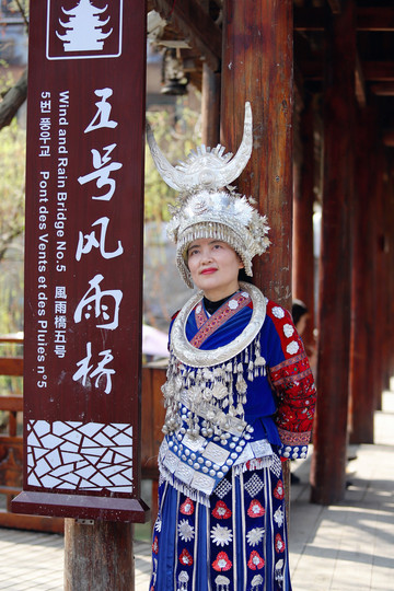 我订的客栈在去观景台的半山腰上,拖着行李边走边欣赏沿途的风土人情,好多游客也入乡随俗,租苗服在风雨桥上吊角楼里留下美好的回忆,苗服的租赁价格大概在30-50元/小时。