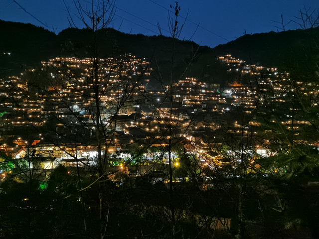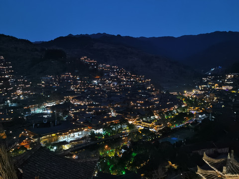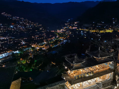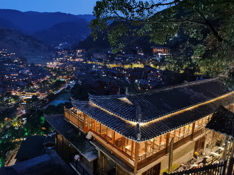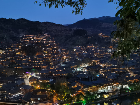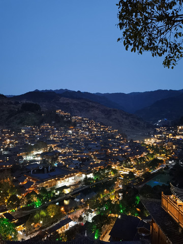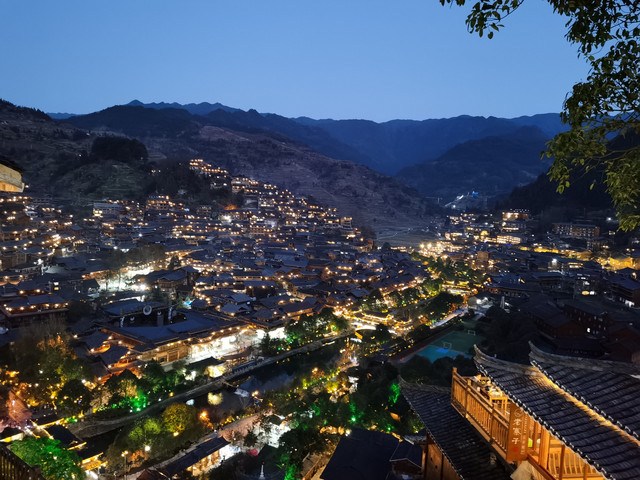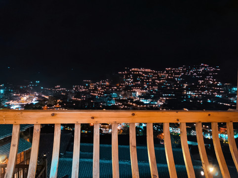 千户苗寨的的夜景确实让人震憾让人流连忘返,观景台上一车又一车的游客蜂拥而来,我突然想起我客栈的阳台上也可以看到夜景,于是以最快的速度跑回客栈,走到阳台上另外一种风景展现在眼前。