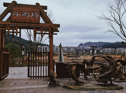 丹寨 小镇斗鸡场坐落在小镇的东湖湖畔,由四面的木桩围和而成,所谓“斗鸡坑”,也是因斗鸡的场地低于四周地面而得名。如有比赛,主人将斗鸡放入斗鸡坑中,两只斗鸡你争我斗,振翅跳跃,人群在旁边围观呐喊,也是小镇一景。