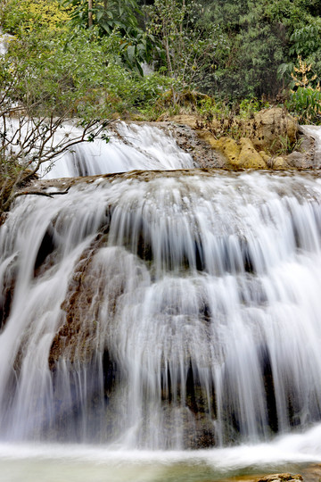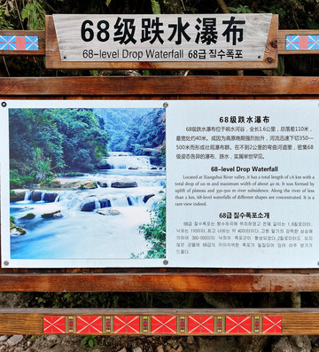 这瀑布有因河水落差形成的河床瀑,有因河水自陡岩上跌落而成的飞瀑。在一段长不足百米的河段,竟形成了20多级层叠的瀑布景观。瀑布落差大的,高有数十米,小的只有一两米,瀑水如雪玉飞溅,白浪闪烁,煞是好看。在长3公里的河段,共有68给瀑布,20多个深潭。附近还有金钟洞景观,因为洞美景宛若仙宫。洞内有蟠桃宴、高达9米的钟乳石钟、 石狮 把道、玉女拂尘、瑶池等等钟乳石景观。