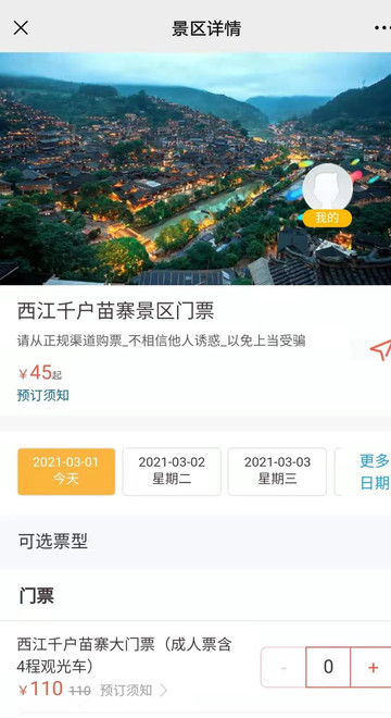 西江景区门票现在实行网上预订,关注微信公众号《西江千户苗寨景区》后在线预订,预订 成功 后刷身份证可进入。110元包括90元门票和20元观光车费(四程:观景台来回及大门来回)