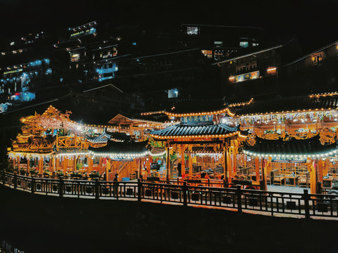 很多人为西江千户苗寨慕名而来就是为一睹苗寨的夜景,每到黄昏时分,千家万户就亮起了灯。星星点点的一片连着一片,随着天色越来越暗,西江千户苗寨变成了灯的海洋,可以看到苗寨呈现那牛头的形状。为使游客更好地观赏西江千户苗寨夜景,观景台位于苗寨的高处在这里可以总揽苗寨的全貌,游客可以在一号风雨桥坐电瓶车到观景台。
