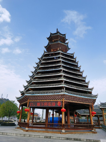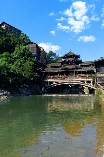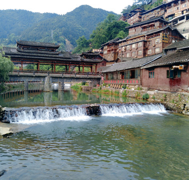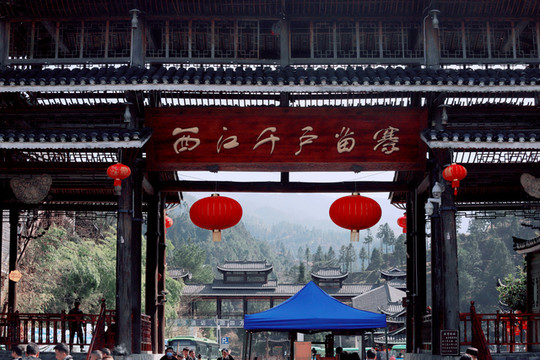 从北大门进入后坐观光车到六号门后正式进入西江苗寨。苗寨的建筑除了吊脚楼,风雨桥也是很有特色的建筑。风雨桥也称花桥,流行于 湖南 、 贵州 、 广西 等地,多建于交通要道的河流上,通常由桥、塔、亭组成,用木料筑成,因行人过往能遮风避雨故而得名。