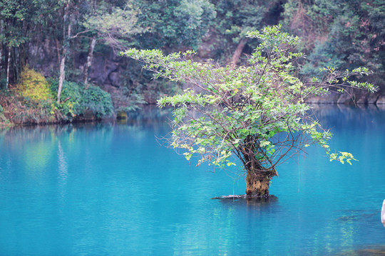 鸳鸯湖是小七孔一奇景,湖水如油,碧绿而凝重。因湖中有两棵并排参天的 大树 而得名,这两颗 大树 半截在水中,枝叶则在上方交握,雌树纤巧秀丽,雄树则两三人才能环抱过来,雄壮挺拔。湖面幽静,水道四通八达,不小心还会迷路,不过湖中经常会有领路的船只行走,一旦迷路只需静静等待救援即可。湖的四周由各种颜色的植物组成,密密高高地包了好几层,在湖中荡舟有一种与世隔绝的感觉。绿色当中还掺杂着红色、粉色的花朵,在阳光下美丽而温暖。
