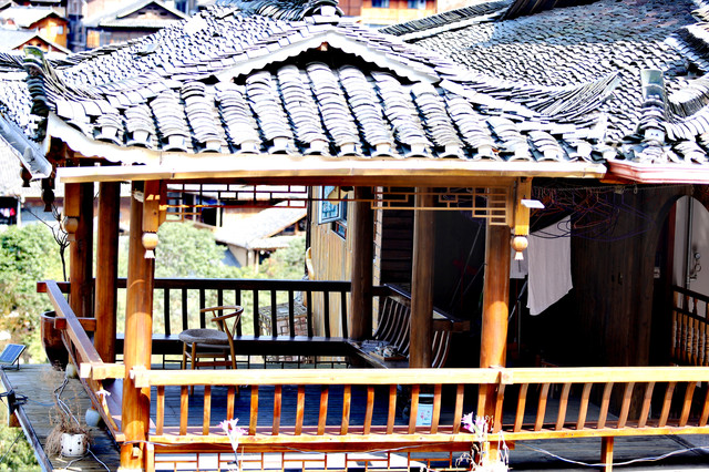 小吃街的尽头就是一号风雨桥,终于坐上电瓶车到达预订的客栈。客栈在去观景台的半山腰上,从客栈的阳台上看去,大半个苗寨尽收眼底。