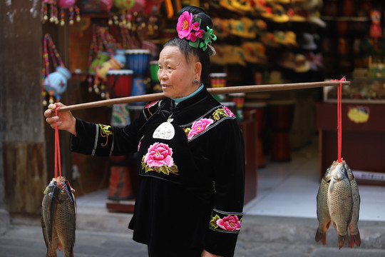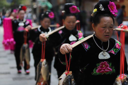 黔东南 苗族侗族自治州有句名言叫“三天不吃酸,走路打乱蹿”。酸汤鱼,在 黔东南 州各地区、各民族都很盛行,以 凯里 及其周边地区最为典型,并发展成为酸汤系列饮食。做酸汤鱼的酸汤,一般用米汤、淘米水加无叶蔬菜发酵而成;也可用西红柿、酸菜、醋制作。酸汤火锅中放人清水江野生鱼,佐以辣椒,酸辣香嫩。一路有也有好多酸汤鱼馆,不时有村民把在田间扑捉的鱼用扁担挑着送到馆,这种独特的风景也让路人忍不住与他们合影。
