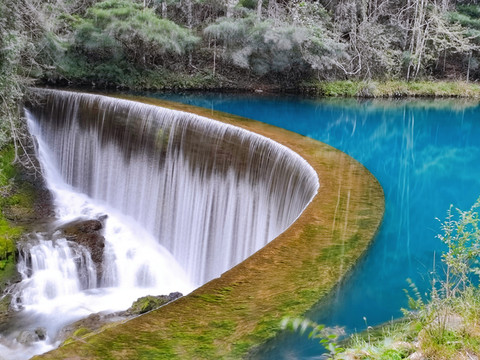 卧龙潭,原名翁龙潭,位于小七孔景区内,是喀斯特暗河——卧龙河的出口处。暗河从崖底涌出,潭面上不见踪影,只见卧龙坝雪崩似的滚水瀑布,潭外流淌不息的渠水,才感到卧龙河在潭底翻动。潭边怪石奇树林立,古木森森,潭外水声轰鸣,雾雨蒙蒙,四周高山紧锁,水潭犹如地底深渊,即便是发洪水时,潭面也犹如镜子般平静。