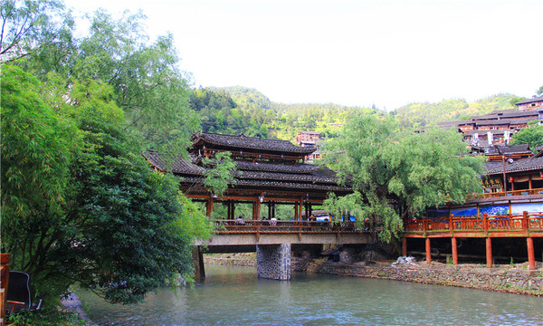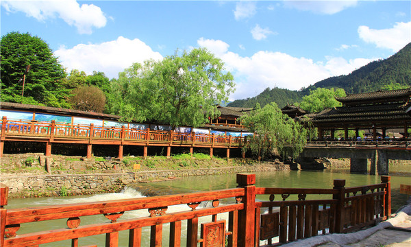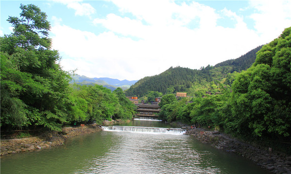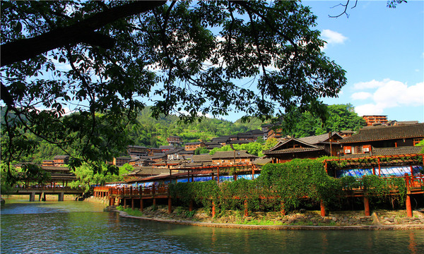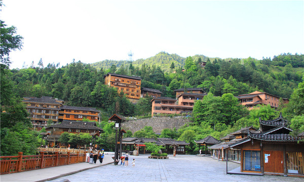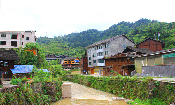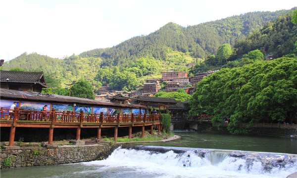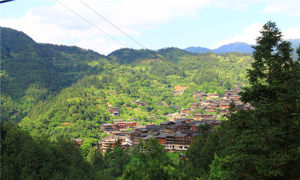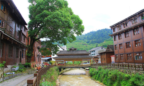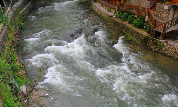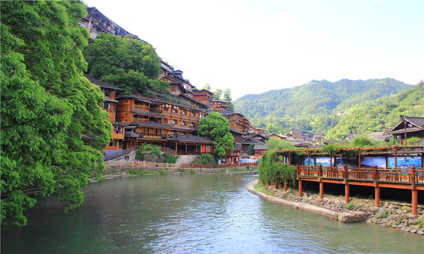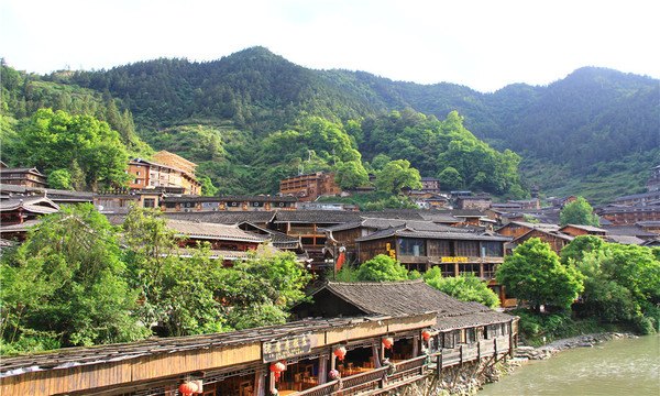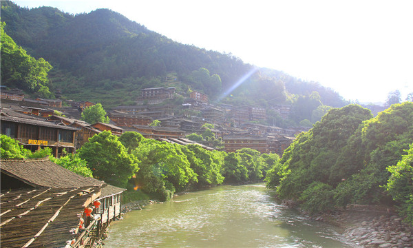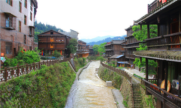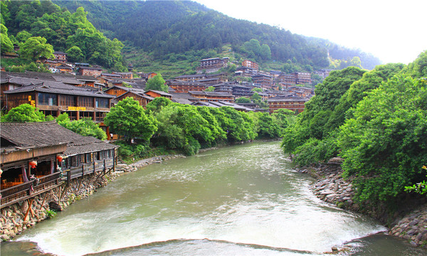 西江千户苗寨所在地形为典型河流谷地,清澈见底的白水河穿寨而过,苗寨的主体位于河流东北侧的河谷坡地上。