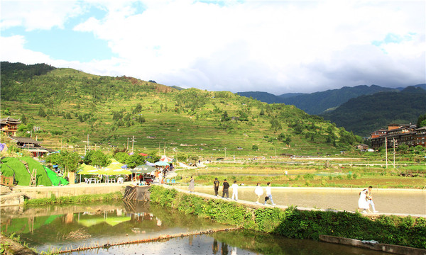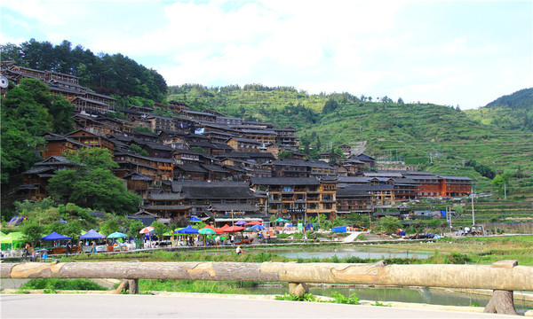 千百年来,西江苗族同胞在这里日出而耕,日落而息,在苗寨上游地区开辟出大片的梯田,形成了农耕文化与田园风光。