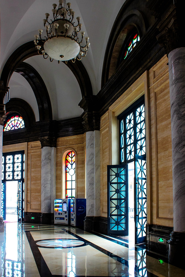 走进飞马水城售票中心,里面果然是很震惊,有4层楼高,金碧辉煌的圆顶造型很西式、很宏伟。