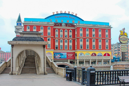 这里其实是坐船的游客码头售票中心,也是飞马水城入口处。非常欧式的建筑,又像教堂又像城堡。这里入场是免门票的,里面个别展览馆是要收取费用的。