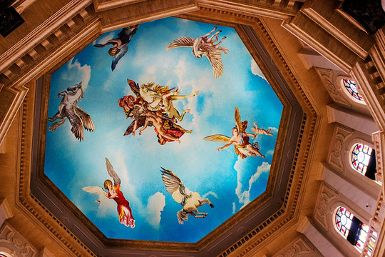 唯美蓝天白云跳跃的天马图案,顶上的穹顶画也是醉了,希腊神话?天马?反正就是模仿欧洲画出马文化就对了。