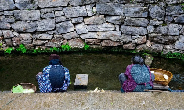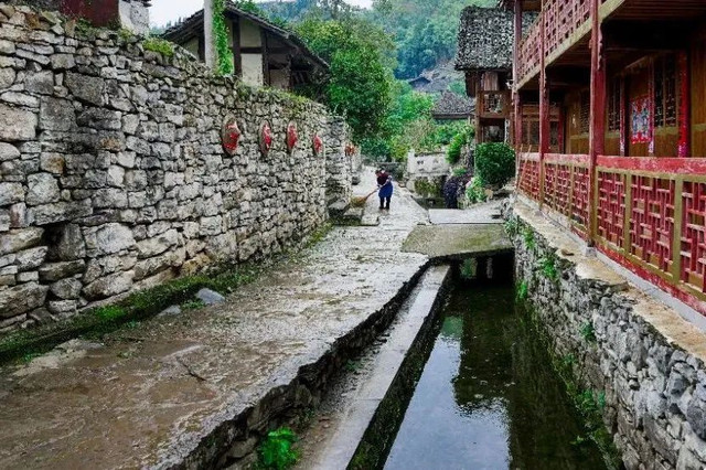 山腰下涌出的泉水,四季长流,泉流成溪。溪水流经后坡田地后,被引入长约800米的人工沟渠,呈S型穿过寨内经青石小巷连接的百余座石砌院落,使村寨的布局如阴阳两仪的太极八卦,似生生不息的世外桃源。