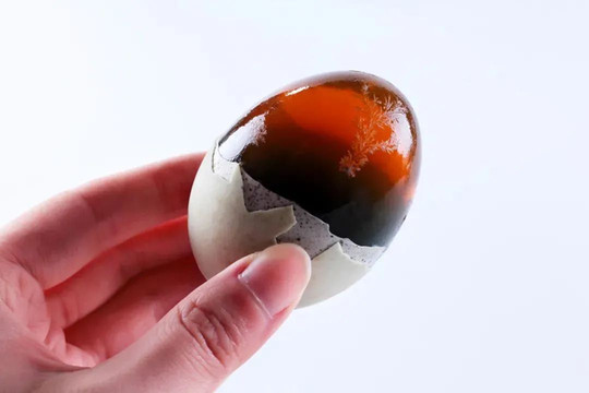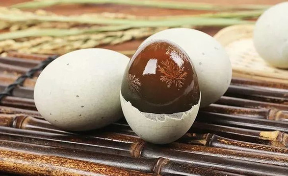 思南松花皮蛋剥开外壳后,蛋身呈褐绿色透明状,松枝结晶花纹清晰可见,蛋心呈胶质体,入口清爽,口感Q弹