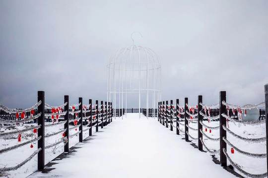 冬季韭菜品山顶的栈道也是雪白的,带给人不一样的观景和体验。