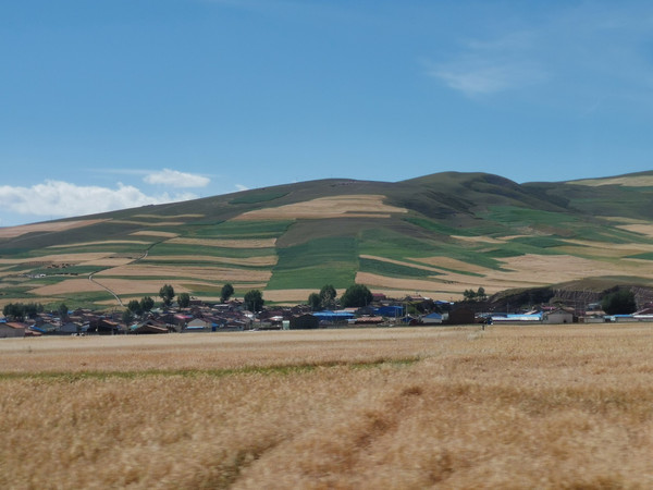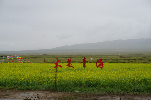 远远的还有很大一片一片的油菜花田,7月至8月是青海油菜花开的季节,我们到时很多都凋谢了。当地牧民会把油菜花田圈起来,里面摆上拍照道具就可以收费了。