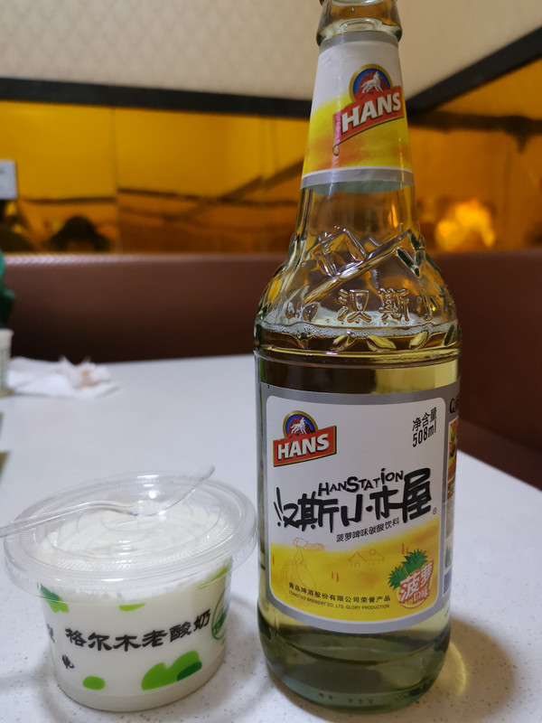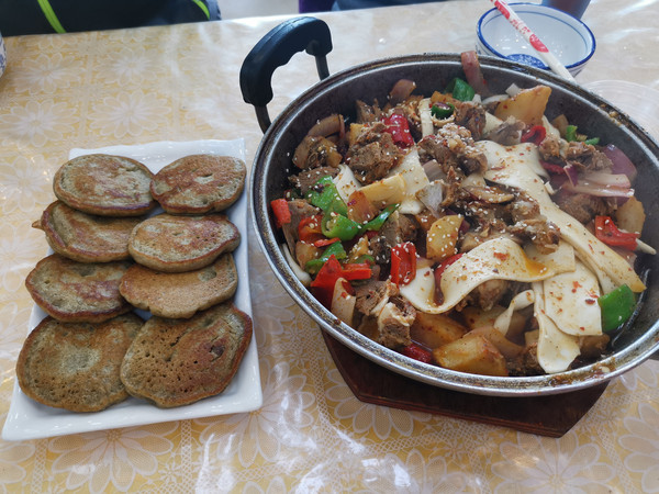 中午司机带我们去吃的饭,肯定是有合作关系的,好在价位在景区附近也算合理了,我们点了特色坑锅羊肉、青稞饼、牦牛酸奶,当地的茶是盐茶。